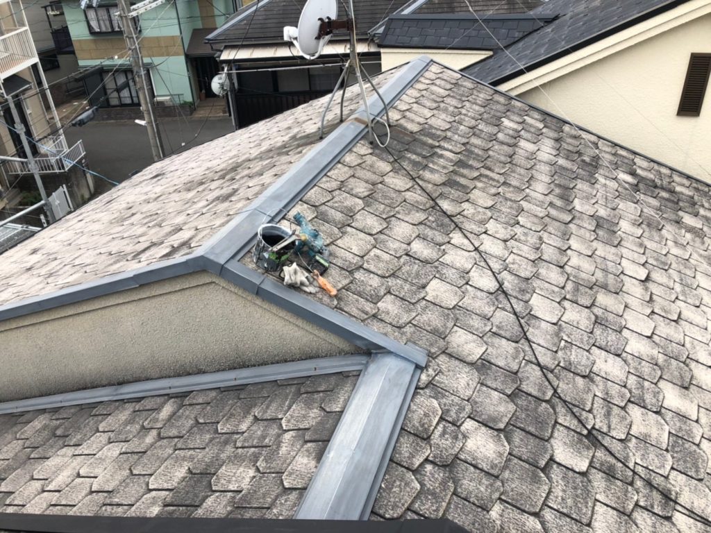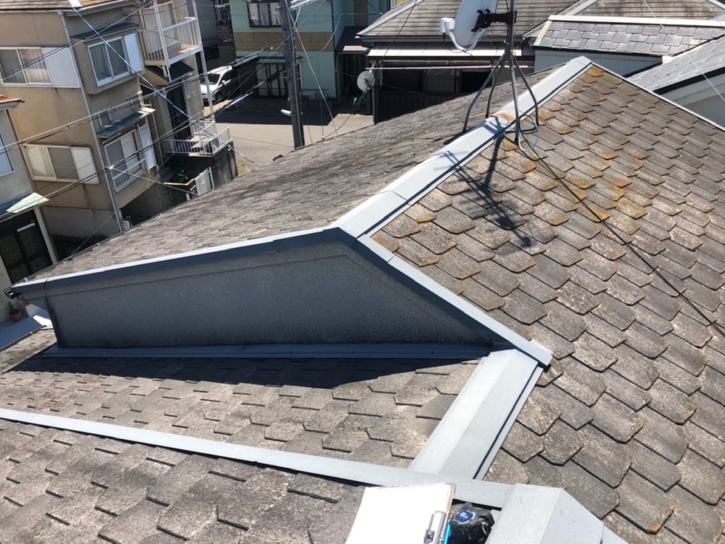まず現状の確認のためハシゴで屋根に上がって確認したところ