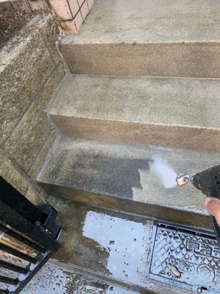 養生して高圧洗浄機で綺麗に洗い流していきます。