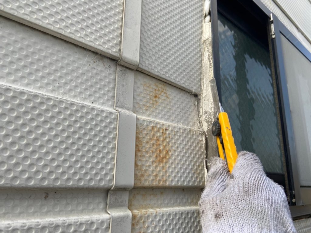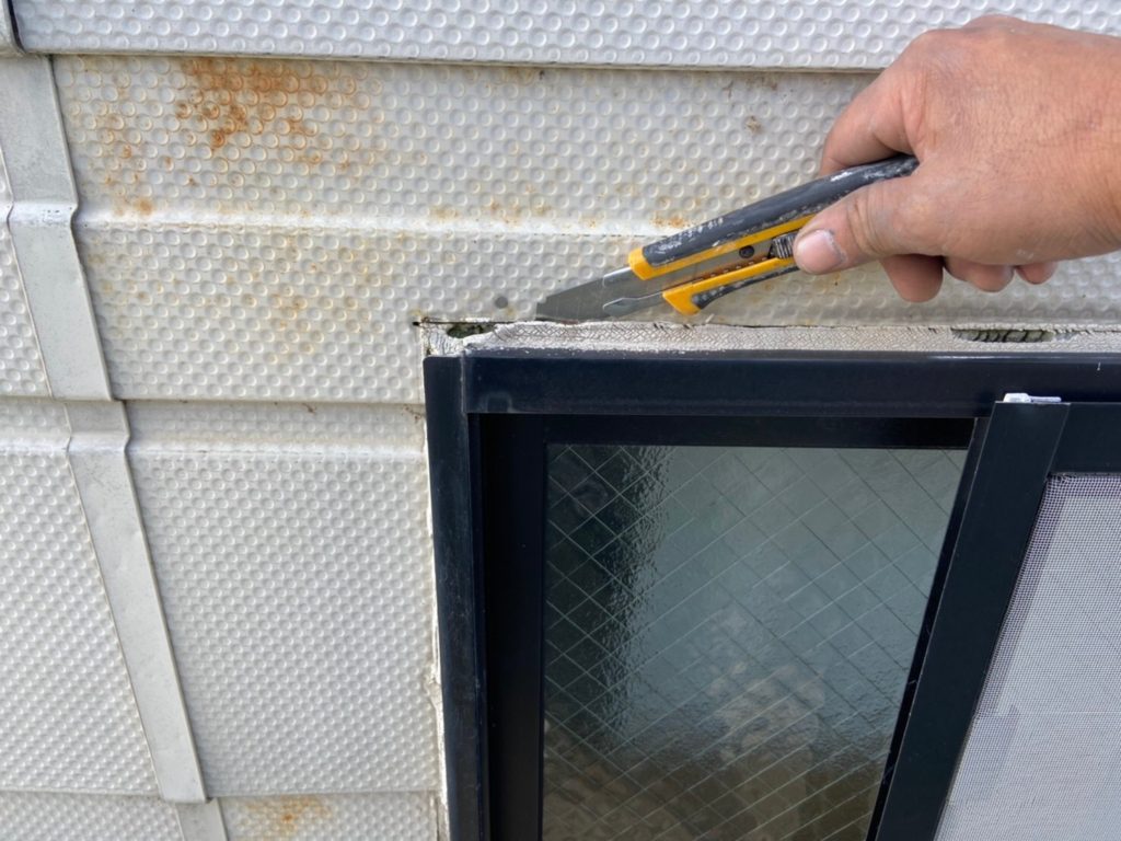 古いコーキングはすべてカッターで撤去していきます。