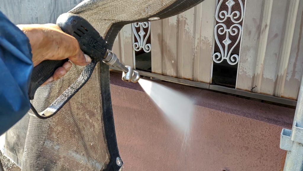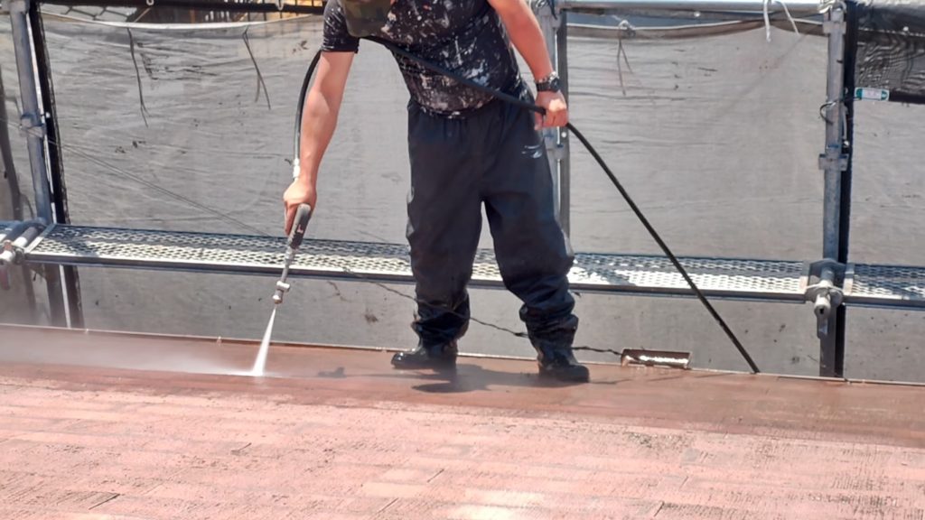 安全に足場組立が完了したら高圧洗浄に入ります。
